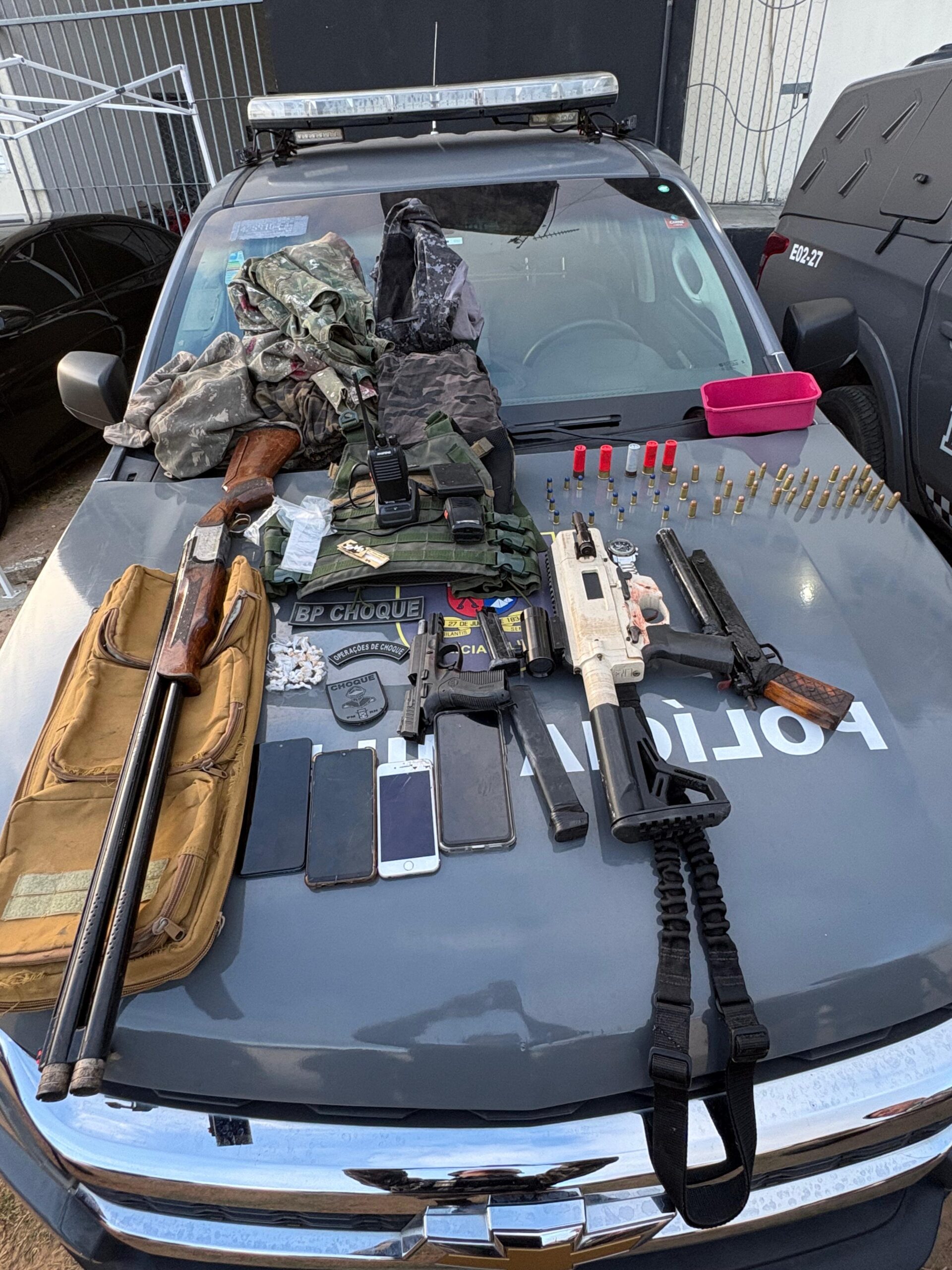 No local, a Polícia Militar apreendeu um arsenal de armas, incluindo uma pistola calibre .380, uma submetralhadora, duas espingardas calibre 12 — sendo uma delas de fabricação artesanal — além de munições, uma placa balística, rádios comunicadores e celulares. Também foram encontradas porções de substância análoga ao crack, balança de precisão e roupas camufladas, indicando possível envolvimento com atividades criminosas.