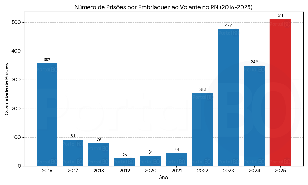 Levantamento histórico do CPRE mostra uma oscilação nos índices ao longo dos anos. Em 2016, foram registradas 357 prisões; em 2017, o número caiu para 91; em 2018, foram 79; em 2019, apenas 25; em 2020, 34; em 2021, 44; em 2022, houve novo crescimento com 253 prisões; em 2023, o total chegou a 477; e em 2024, foram contabilizados 349 casos. Em 2025, pela Lei Seca tradicional, houve 23 prisões, enquanto a Operação Zero Álcool concentrou 488 flagrantes no mesmo período.